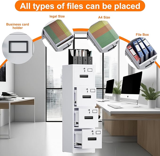 - Ideal for Home Offices with Versatile Storage: With dimensions of 17.72"D x 14.96"W x 55.2"H, the 4 drawer File Cabinet for home office can accommodate a variety of folder sizes, including A4, legal, and letter, making it a versatile storage solution. The cabinet's sleek design and robust construction make it a valuable addition to any home office, enhancing both functionality and aesthetics;