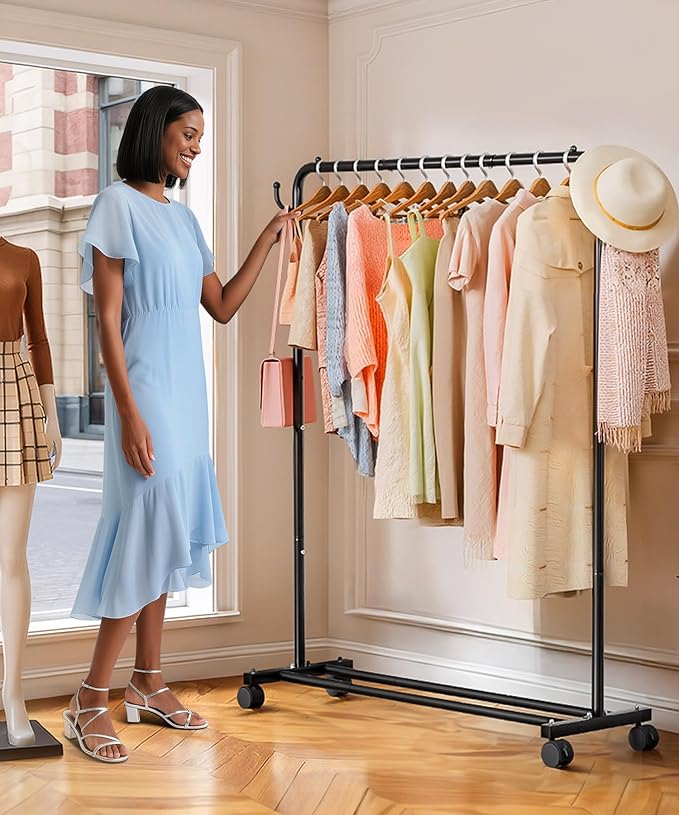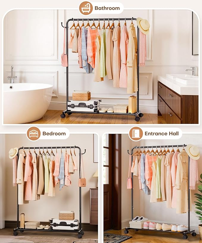 - Multi-Space Clothing Rack for Home/Store: Roll between bedroom (clothing organizer), entryway (coat stand), laundry room (drying rack), and boutique (apparel display). Compact 46"W x 53"H fits apartments, garages, pop-up shops, and guest rooms