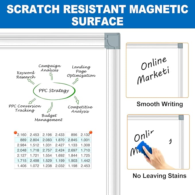 - PREMIUM MAGNETIC DRY ERASE BOARD: Crafted with a specially lacquered surface for a smooth and durable writing experience, our magnetic dry erase board boasts high-quality construction. The robust silver aluminum frame is scratch-resistant, and the ABS plastic corners with secure screw-fixing ensure safety and long-lasting durability. The detachable marker tray keeps writing essentials within reach, emphasizing convenience and safety without any sharp edges.