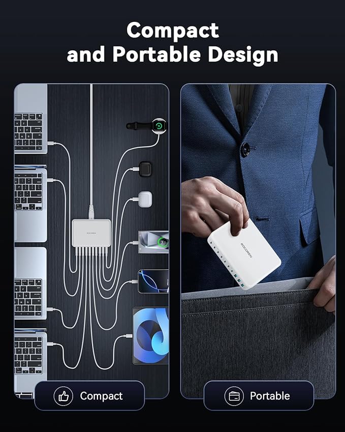 - Widely Compatibility:This Rocoren GaN charger supports a maximum output power of 100W on the C1 and C3 ports, a maximum output power of 65W on the C2 and C4 ports and a maximum output power of 45W on the C5 port. The usb c charger station also supports most fast charging protocols such as PD3.0, QC4.0, QC3.0, QC2.0, AFC, FCP, PPS, etc. compatible with MacBook Pro 16", 14", 13", MacBook Air, Dell XPS, compatible with iPhone 16,15 Pro/14 Pro Max/13/12, Samsung Galaxy S25 Plus/S24 Ultra/ S23 /S22, Moto G51/Razr 50 Ultra,OnePlus 13/Ace 3/5Pro,for iPad Pro, iPad Air Series AirPods Pro,for AppleWatch,Switch, Steam Deck and more