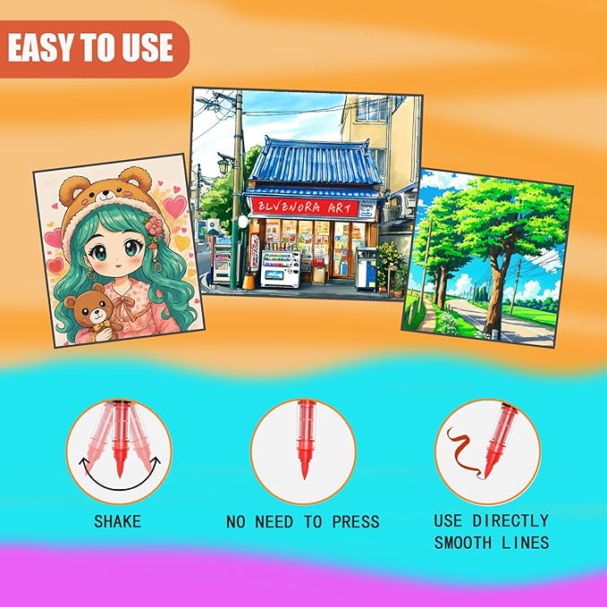 - 🖌️Soft Brush Tip with Smart Ink Control:Equipped with a 1–5mm soft brush tip and an advanced ink regulation system, these markers ensure smooth, even flow without blotting or skipping. Easily switch between precise outlines and wide strokes—perfect for both detailing and coloring large areas.