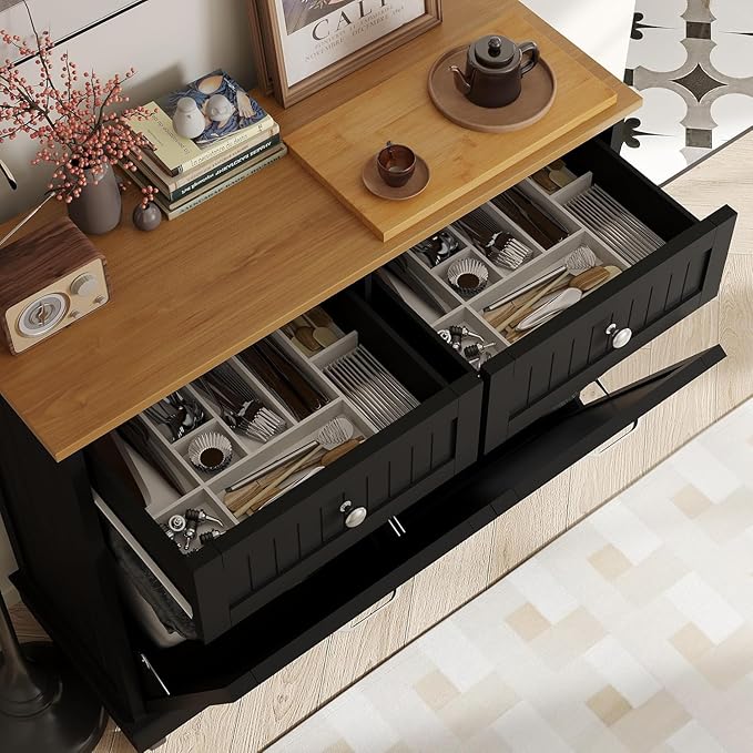 - Hide Mess, Reveal Style: Tired of staring at a bulky trash bin? This hideaway trash can cabinet conceals odors and clutter behind its tilt-out door, keeping your kitchen or laundry room instantly tidy. Fits standard 10-gallon bags (dimensions: 39.3"L x 13.1"W x 36"H), yet looks sleek enough to complement farmhouse or modern decor